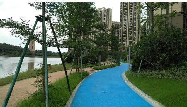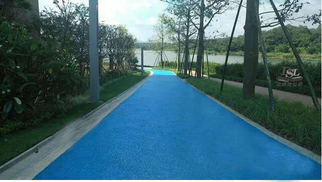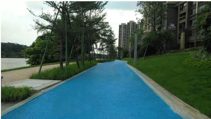 祝賀廣東佛山中信山語湖透水混凝土地坪項目竣工,達成地石麗小區(qū)透水地坪, 藍色透水混凝土地坪案例,藍色透水地坪案例是小區(qū)透水混凝土路面鋪裝經(jīng)典案例。