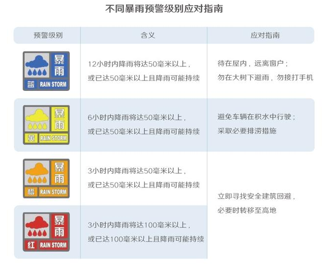 為了應(yīng)對頻繁發(fā)生的城市內(nèi)澇,各地相關(guān)部門正在逐步改進排水系統(tǒng),力求將內(nèi)澇消滅在襁褓之中。而在城市防范措施建設(shè)完善的過程中,從自己做起,盡可能避免內(nèi)澇帶來的危險,仍是我們每個人需要認(rèn)真對待的大事。暴雨預(yù)警是避災(zāi)的“指揮棒”。即使是最低一級的暴雨藍(lán)色預(yù)警,也足以成為停止外出計劃的理由。那么,你知道不同的預(yù)警級別都代表著什么意思嗎?