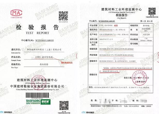盡管該新國標(biāo)定于11月1日才開始強(qiáng)制執(zhí)行,但根據(jù)中國建材檢驗(yàn)認(rèn)證集團(tuán)(以下簡稱“國檢集團(tuán)”)CTC檢測中心提供的檢驗(yàn)報告,德國巴斯夫和上海都佰城的ETPU透水型跑道以及無溶劑聚氨酯膠粘劑等已按照新國標(biāo)全部項目檢測合格。