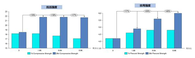 來自同濟(jì)大學(xué)材料學(xué)院實(shí)驗(yàn)室的測試數(shù)據(jù)表明,聚合物對于透水混凝土最終抗壓抗折強(qiáng)度均有大幅提高,特別是隨著聚灰比的增加抗折強(qiáng)度(路面材料最關(guān)鍵的指標(biāo))不斷提升。
