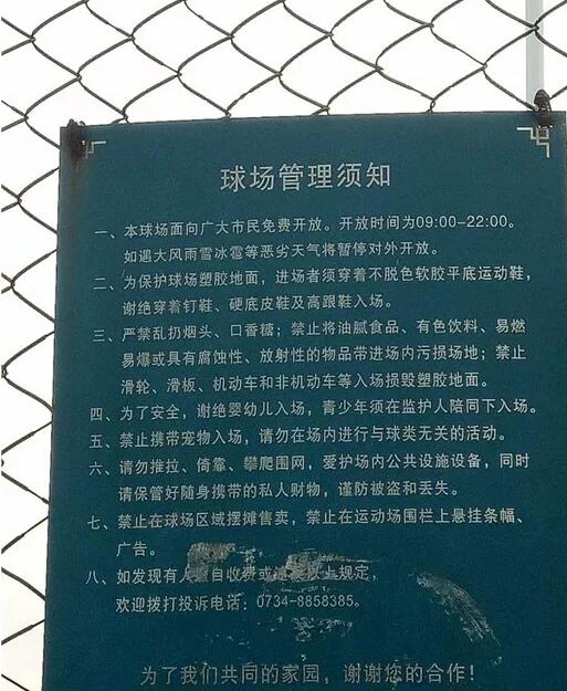 5月23日下午,記者在平湖公園入口處看到,顯眼位置張貼著的《球場管理須知》上明確寫著:為保護(hù)球場塑膠地面,謝絕穿著釘鞋、硬底皮鞋及高跟鞋入場;禁止攜帶寵物入場。