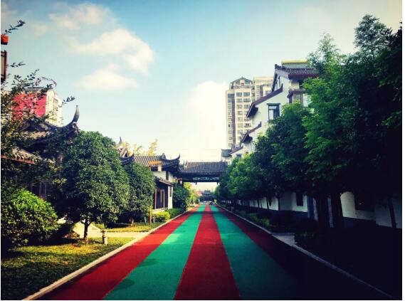 跑道是彩色的,紅色間著綠色,三條是紅色的,兩條是綠色的,像是彩色的五線(xiàn)譜攤鋪在綠色的畫(huà)板上一般。