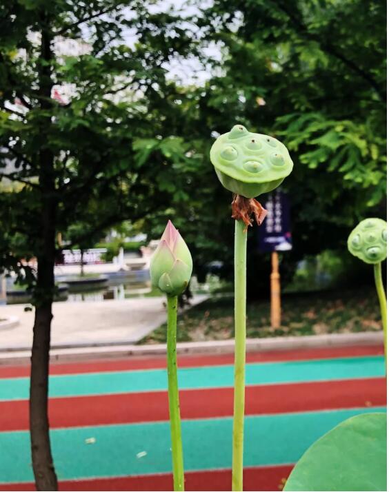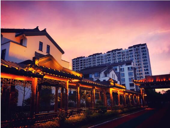 最南邊是一個(gè)小型的兒童露天樂(lè)園,幾個(gè)紅色、黃色、藍(lán)色的滑梯、迷宮、秋千,圍成一個(gè)小天地;兒童樂(lè)園的北面是一個(gè)泳池連著的飛檐峭壁的中式建筑,在建筑物的北面有一個(gè)小橋、流水、石板路散布其中的荷花池,荷花池的西側(cè)是用太湖石堆砌出的一座假山;再向北又是一個(gè)小水池和小廣場(chǎng),小廣場(chǎng)上放置著一些單杠、雙杠及老年人用的健身器材。