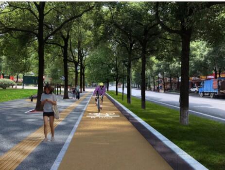 根據(jù)設(shè)計(jì)方案,慢行道將非機(jī)動(dòng)車道與人行道設(shè)置在同一平面,兩者鋪裝不同顏色進(jìn)行視覺(jué)上的分割,解決機(jī)動(dòng)車與非機(jī)動(dòng)車混行的現(xiàn)狀。
