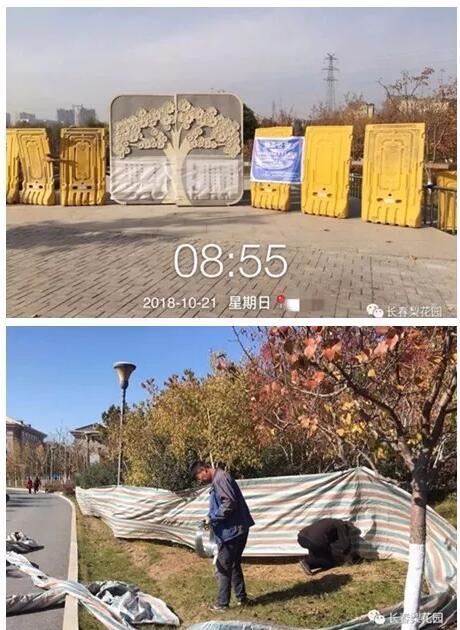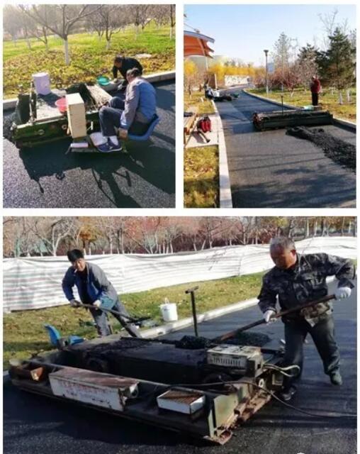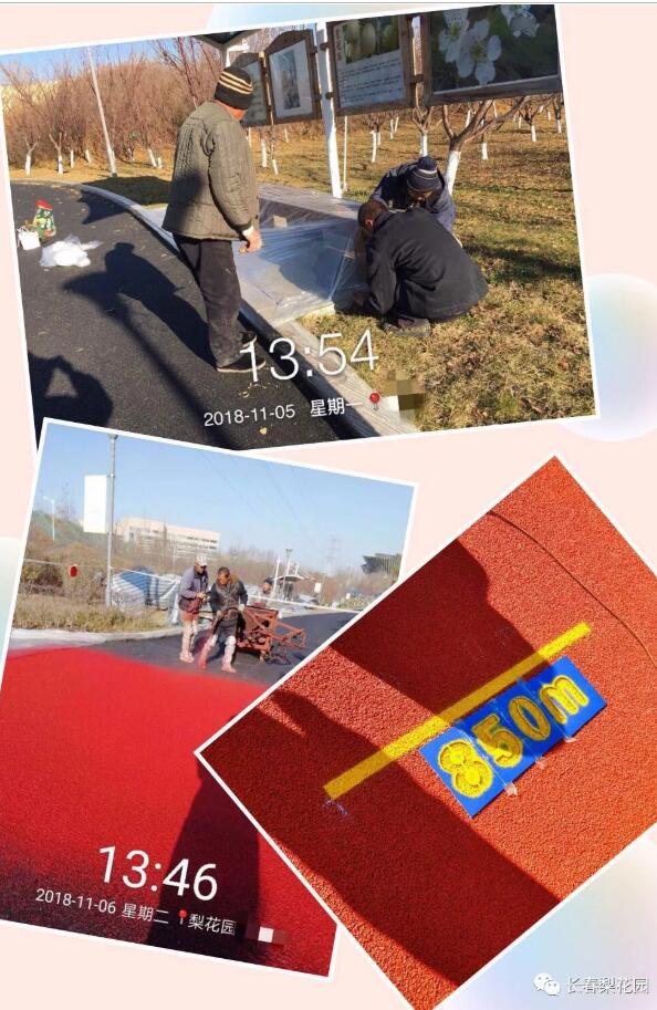 10月20日,原料進場,施工用膠(聚氨酯)及黑顆粒(橡膠)均符合國家環(huán)保標(biāo)準(zhǔn)。次日,塑膠跑道鋪裝工作正式開始。為保證跑道的整體質(zhì)量,施工現(xiàn)場不允許踩踏,這對于一個開放式公園頗有難度,施工方配合梨花園管理所在機器進場后第一時間將梨花園大小共8處出入口全部用擋板封閉,園內(nèi)主要綠地用彩條布加以圍擋,在不同位置分別張貼施工公告。梨花園管理所錄制音頻利用園內(nèi)廣播循環(huán)播放,提醒游人封園期限、施工原因及內(nèi)容,方便園區(qū)管理的同時,也得到了游客的理解和配合。
