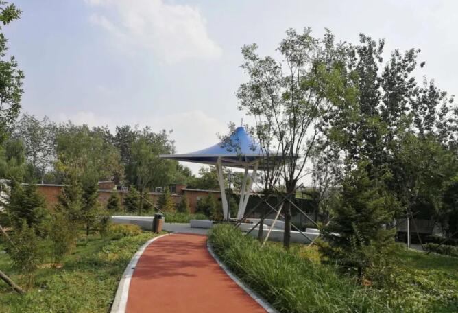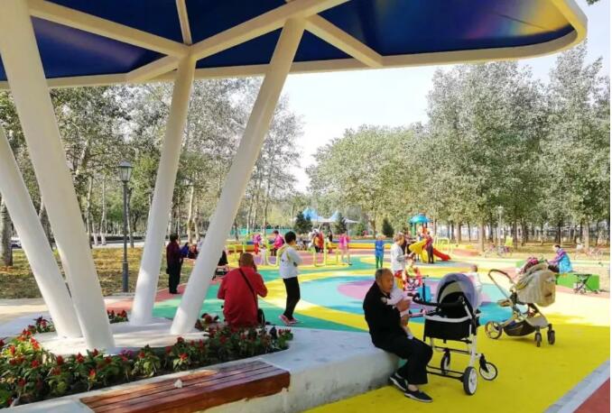 該項(xiàng)目設(shè)計理念由“一帶五園”貫穿,“一帶”是根據(jù)區(qū)域紅色文化特性,采用紅色塑膠跑道環(huán)繞整個場地。“五園”是根據(jù)區(qū)域有皇家園林特性,由寄暢香洲,兒童七彩樂園、綠蔭廣場、彩虹雙苑、翠竹聞鶯組成,加以種植喬木、灌木同時配以特色小品、燈光等,達(dá)到簡潔、開放、舒適的整體風(fēng)格。之前連路燈都沒有,現(xiàn)在,800米的塑膠跑道邊還有夜跑燈呢!