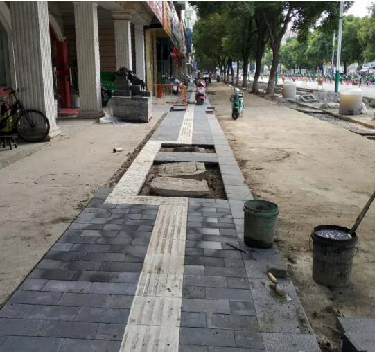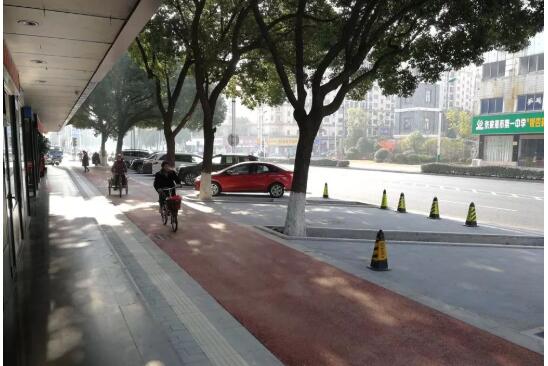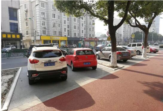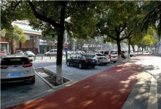 目前道路沿線有條件增設(shè)停車位的地方都已經(jīng)改造一新,改造停車位400余個。停車位路面根據(jù)不同功能分別鋪設(shè)了透水粒子、水泥磚、草坪磚等;非機動車道鋪設(shè)了彩色瀝青。