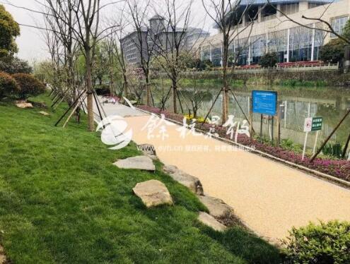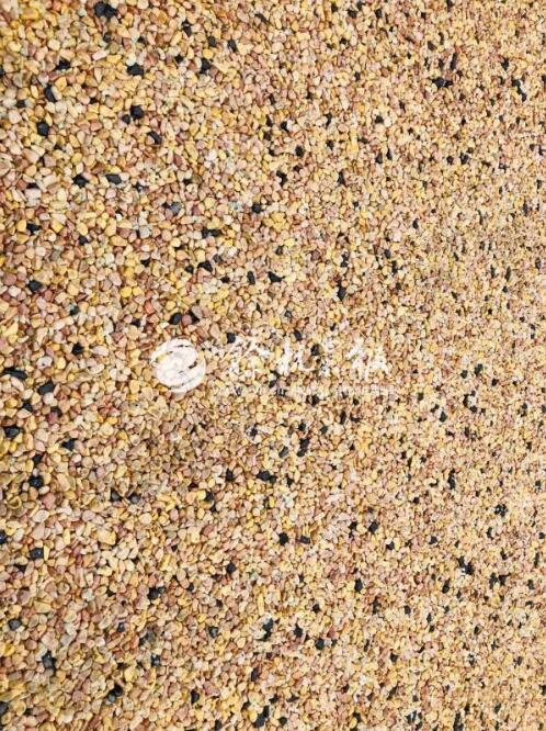 新鋪的路面,是由一顆顆黃豆大小的小石子組成的,石子的顏色挺好看,有黑色、黃色、米色,每一顆都經(jīng)過(guò)打磨,比較光滑。