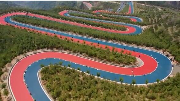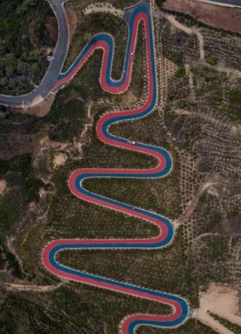 5月7日,山西省太原市,無人機航拍西山旅游公路一段彩色路面。這段公路鋪設(shè)了紅藍兩色瀝青,為當(dāng)?shù)嘏e辦國際公路自行車賽專用賽道。從高空俯瞰,這段公路彎彎曲曲,色彩鮮艷,橫亙在高海拔山頂,被當(dāng)?shù)孛癖姺Q為“云端上的彩虹公路”。