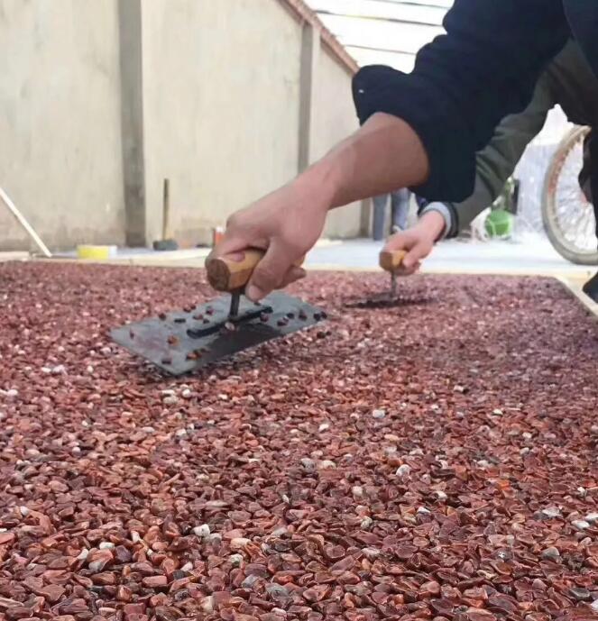 透水膠粘石以改性樹脂膠為粘接劑,各種天然石子、彩砂、彩色石子等)為骨料,加入多種高分子添加劑經混拌制成。 彩色透水地坪擁有系列色彩配方,配合設計的的創(chuàng)意,中間的孔隙無水泥、砂等細骨料填充,因此為了增加鋪裝強度,必須添加各種性能的專用強化劑。針對不同環(huán)境和個性要求進行鋪設施工。施工人員按照路面地塊、樹池等不同地塊需求進行現(xiàn)場鋪設、安裝,待整個路面鋪設完畢后覆蓋塑料膜加以保護,并噴上一層保護劑,確保材料徹底變干后顏色能長期保有,同時也可延長路面使用壽命。