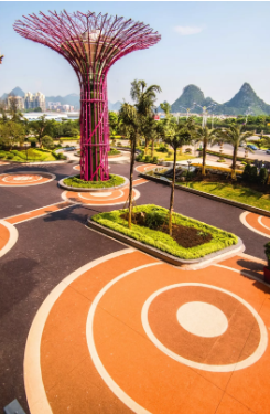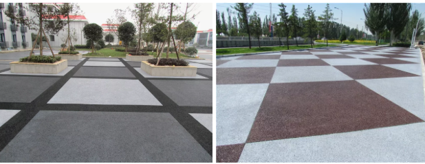 近年來透水鋪裝作為一種主流的鋪裝形式成為城市公共空間的重要組成部分。在進行設計時,顏色、圖案、功能等元素與不同尺度的空間、小品、建筑、植物等相結(jié)合,創(chuàng)造出豐富多樣的公共空間,為人們帶來不一樣的感受。尤其是色彩和圖案的表現(xiàn)與搭配是環(huán)境主要的造景要素,是心靈表現(xiàn)的一種手段,它能把風景強烈地訴諸于情感,從而作用于人的心理。因此在透水混凝土鋪裝的設計過程中,色彩和圖案更應該和植物、山水、建筑等統(tǒng)一起來,進行綜合設計。