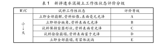 制備工藝對透水混凝土的性能具有多方面的影響,如水泥裹石法、“濕—濕”工藝、上置式振動成型法分別可對其抗壓強(qiáng)度、強(qiáng)度均勻性、孔隙率以及平整度等性能做出不同程度的調(diào)整。在比較了不同的透水混凝土成型工藝后,張賢超發(fā)現(xiàn)采用漿體裹石法之后的透水混凝土,其抗壓強(qiáng)度能得到 10% 的提高,透水率及其他基本性能也得到了明顯改善。秦旭朝研究了新拌透水混凝土的工作性狀態(tài),結(jié)合其表觀性狀和結(jié)構(gòu)特點對其工作性狀態(tài)提出了一種評價分級體系,見表1;其中代表著水泥漿稠度過大,難以均勻包覆粗骨料的等級“A”和“B”,以及代表著水泥漿太稀,難以穩(wěn)定膠結(jié)于粗骨料上的等級“D”和“E”均是不合格的。只有等級“C”方能合格。