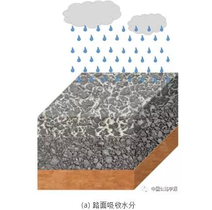 可以通過(guò)改變路面材料的熱物理性質(zhì)和路面與環(huán)境的熱交換方式,從而得到具有降溫功能的路面。具體的實(shí)現(xiàn)途徑為,以多孔路面材料為基體,在其孔隙中灌注吸水保水性材料,這種材料具有較好的吸水和保水能力(圖5)。在雨天或者灑水時(shí),能夠吸收水分,當(dāng)環(huán)境溫度較高時(shí),利用路面材料中持有的水分蒸發(fā)來(lái)降低路面溫度,減弱熱量在瀝青路面中的積累,改善瀝青路面的熱輻射效應(yīng),可以降低路表和路域的環(huán)境溫度,為道路周?chē)牡男腥撕托熊?chē)提供舒適的環(huán)境,從而起到緩解城市“熱島效應(yīng)”作用。其實(shí)現(xiàn)原理如圖6所示。