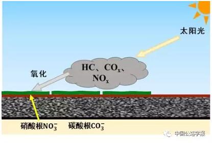 路面材料是汽車(chē)尾氣的直接承受者,若能夠?qū)呐艢夤艿琅懦龅钠?chē)尾氣凈化成對(duì)人體無(wú)害的物質(zhì),將會(huì)有效的減少空氣污染。其實(shí)現(xiàn)路徑可以通過(guò)在路面材料表面涂刷光催化涂料,在日光或可見(jiàn)光的照射下,通過(guò)把光能轉(zhuǎn)化為化學(xué)能,將汽車(chē)尾氣中的主要污染物質(zhì)碳氧化物和氮氧化物污染物催化氧化為無(wú)害物質(zhì)。這種光催化涂料在雨水或人工灑水的作用下,能夠活化再生,重復(fù)使用,圖7所示為路面材料分解尾氣的技術(shù)路徑。