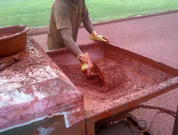 施工時(shí)應(yīng)一邊刷膠水一邊鋪彩色顆粒層。當(dāng)膠水固化后再鋪設(shè)彩色顆粒層會(huì)影響粘結(jié),不宜大面積涂膠后,再鋪顆粒層,應(yīng)做到刷膠水多少面積,應(yīng)立即鋪多少面積的顆粒。