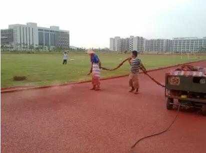 7 保持塑膠跑道的清潔,經(jīng)常用水噴淋清洗,洗后膠面少量余水可用干布抹去。若塑膠跑道沾上了油污,可用10%氨水或洗滌劑、洗衣粉等擦洗干凈。