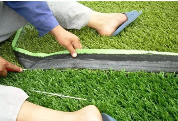 用專用工具按規(guī)格對草坪進行切邊,對縫,并用專用接縫膠及接縫帶粘接人工草坪。
