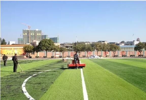 用鋪砂機及專用工具將石英砂沖入草坪,使其均勻平整,石英砂填充量為每平米25kg左右。