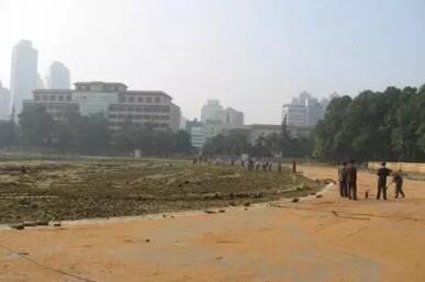 (2)基礎(chǔ)排水:采用龜背式排水,兩片球場(chǎng)排水溝相連形成環(huán)狀排水溝,達(dá)到場(chǎng)地排水要求。橫向、縱向坡度<3‰,表面應(yīng)平坦,光滑,保證排水。