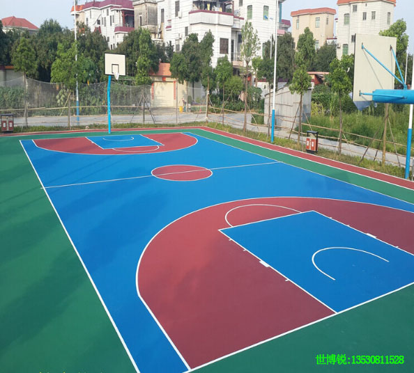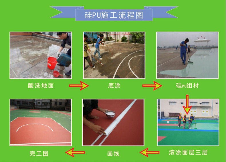 硅PU籃球場使用的硅PU材料是在PU球場材料的基礎(chǔ)上開發(fā)研制出來的新一代球場地面鋪裝材料,從根本上有效地解決了PU球場材料在專業(yè)性能、環(huán)保施工、使用壽命、日常維護(hù)等方面的不足之處,具有實用、環(huán)保、專業(yè)、經(jīng)濟(jì)的優(yōu)良性能。硅PU籃球場是由有機(jī)硅改性聚氨酯材料作為涂料,分多層(底涂、彈性層、加強(qiáng)層、面層)涂刮而成的新型塑膠球場;具上彈下彈結(jié)構(gòu)特征,屬于一種健康型專業(yè)彈性合成球場地面系統(tǒng)。