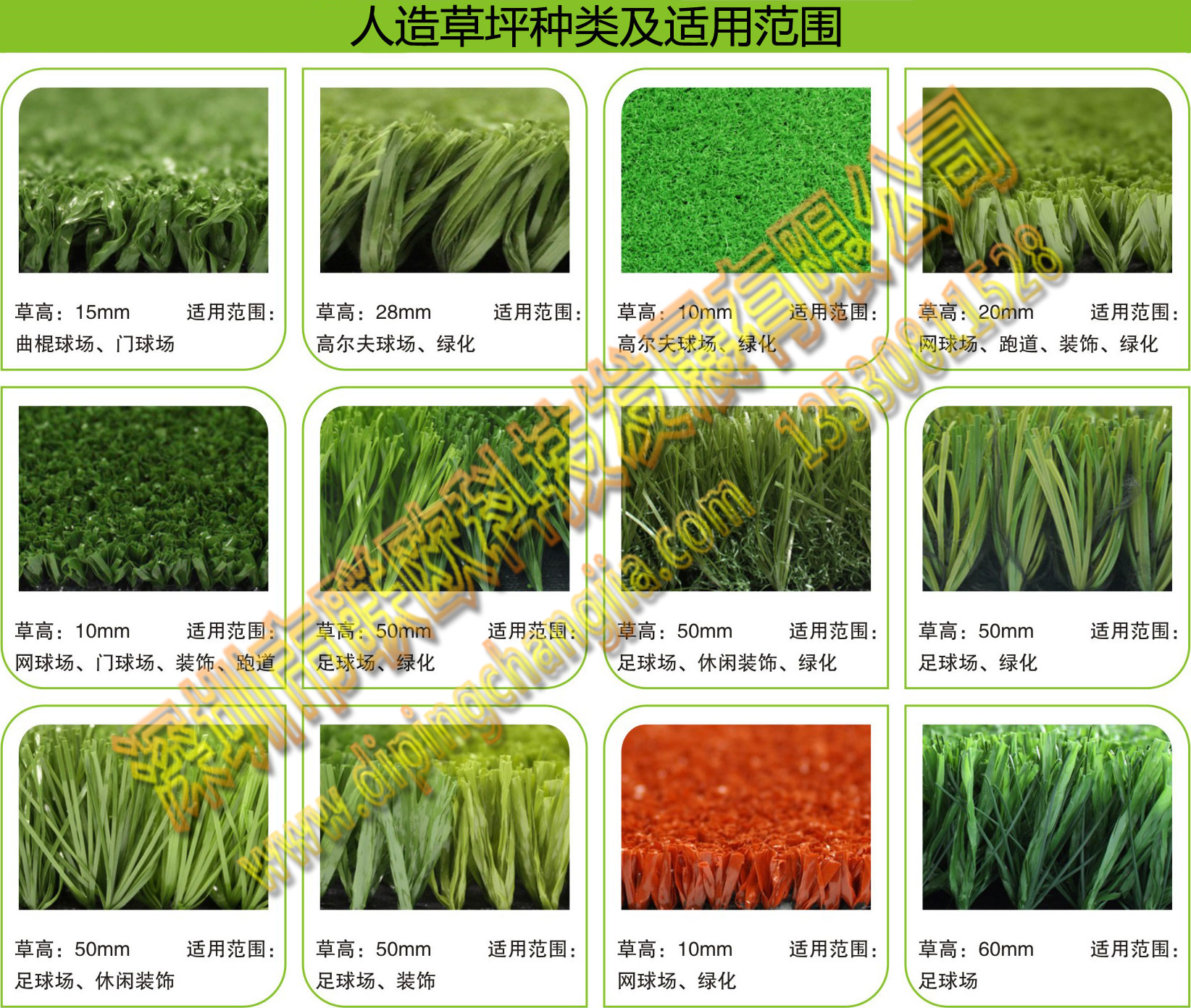 人造草坪主要適用于人造草足球場、網(wǎng)球場、曲棍球場、門球場、高爾夫球場、棒球場、板球場、橄欖球場、籃球場、羽毛球場等運動場地。同時也適用于室內(nèi)外裝飾,庭院景觀及樓宇綠化。