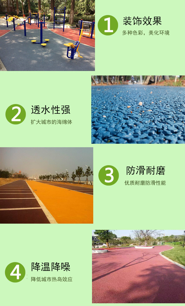彩色透水混凝土不僅有裝飾美觀的作用,且色彩繽紛可以景觀相融合,使城市環(huán)境建設更加和諧,是保護自然、維護生態(tài)平衡、緩解城市熱島效應的一種優(yōu)良海綿城市透水地坪材料。在城市雨水管理與水污染防治等工作上,具有極其深遠的意義,有利于人類生存環(huán)境的良性發(fā)展。