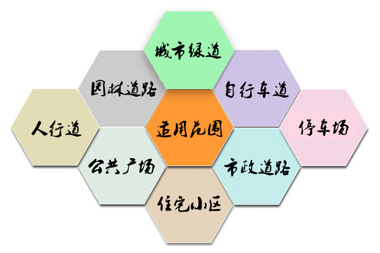 彩色透水混凝土主要應用于人行道、自行車道、公共廣場、停車場、住宅小區(qū)、園林道路、市政道路、城市綠道和中央隔離帶等。