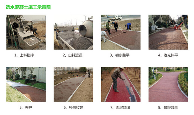 彩色透水混凝土是由小石子、42.5水泥、摻和透水外加劑、水、彩色強化劑以及穩(wěn)定劑等經(jīng)一定比例調(diào)配拌制而成的一種多孔輕質(zhì)的新型環(huán)保地面鋪裝材料。彩色透水混凝土是用表面粗骨料包裹著一層薄漿料相互粘結(jié)成蜂窩狀,它擁有約20%左右的孔隙,下雨時能夠讓雨水快速的流入地下,補充城市地下水資源;并能吸收車輛行駛產(chǎn)生噪音,能減少地面陽光反射熱能,降低地面溫度,減少城市“熱島效應”;還能有效的消除地面上的油類化合物等對環(huán)境污染的危害;